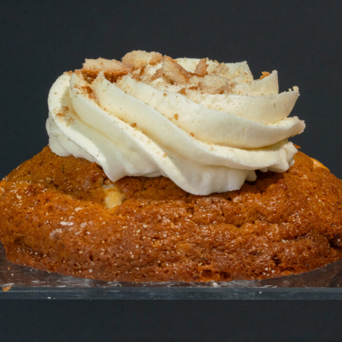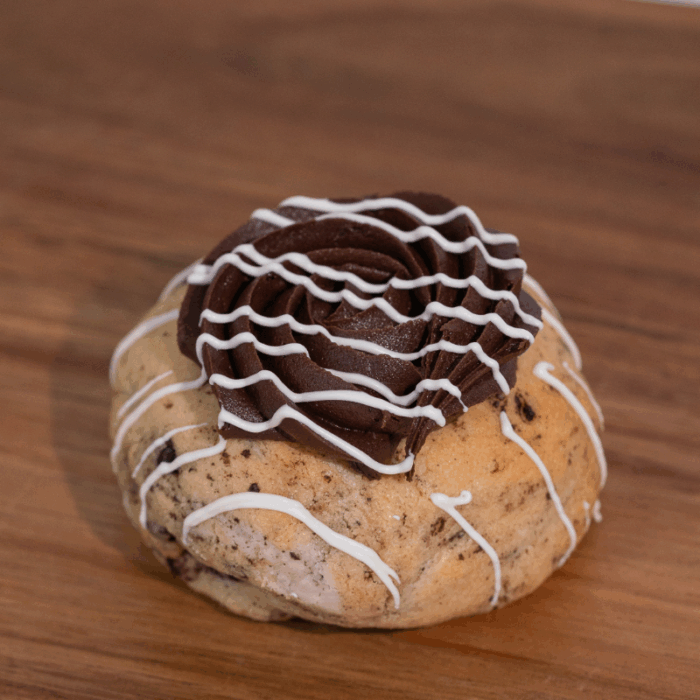A soft vanilla base cookie loaded with Oreo pieces and white chocolate and finished with a chocolate buttercream