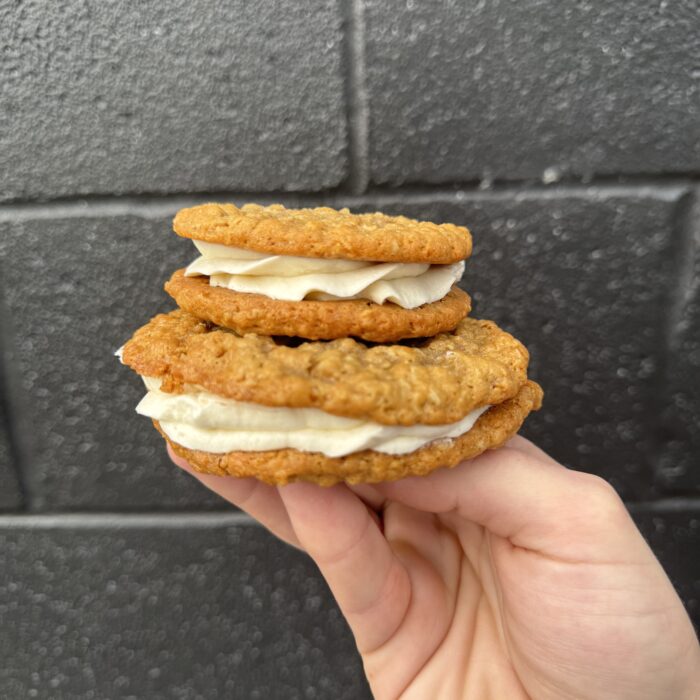 Two soft oatmeal cookies sandwiched with fluffy vanilla buttercream.