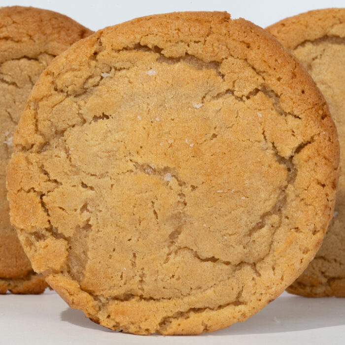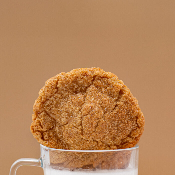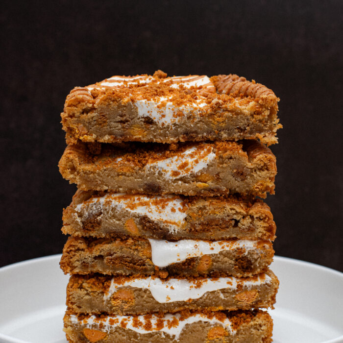 A hefty scoop of marshmallow fluff (gelatin- free) on baked top of a cinnamon base cookie, then finished with a drizzle of Biscoff butter and cookie butter crumbles