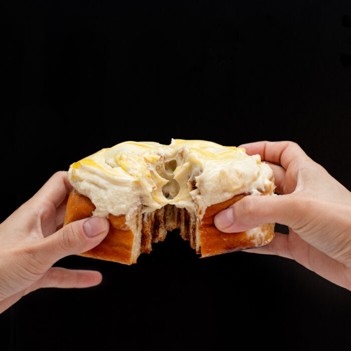 A vanilla base cookie rolled into a spiral with a cinnamon sugar filling baked to perfection and finished with a vanilla bean glaze for the perfect combo