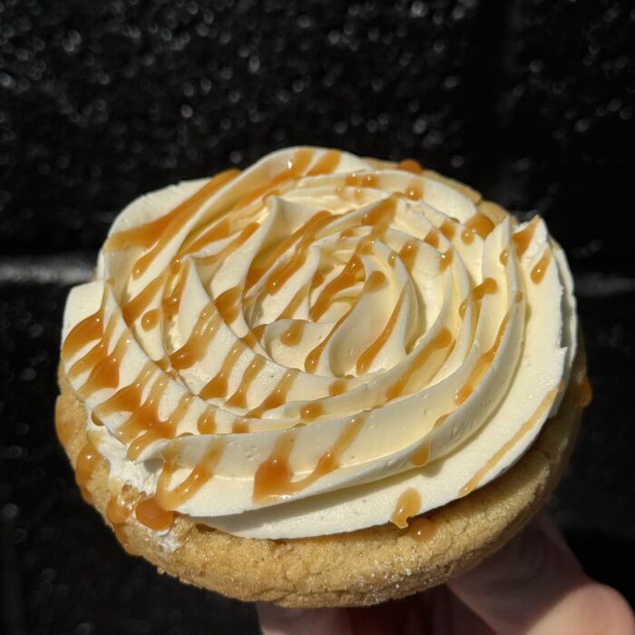 A soft cinnamon base cookie stuffed with cookie butter and drizzled with melted cookie butter and finished with more Biscoff crumbles