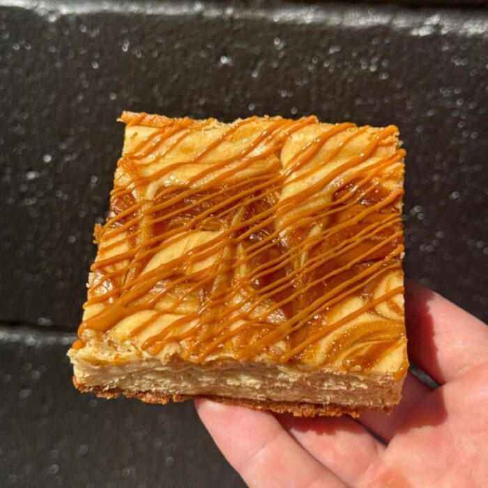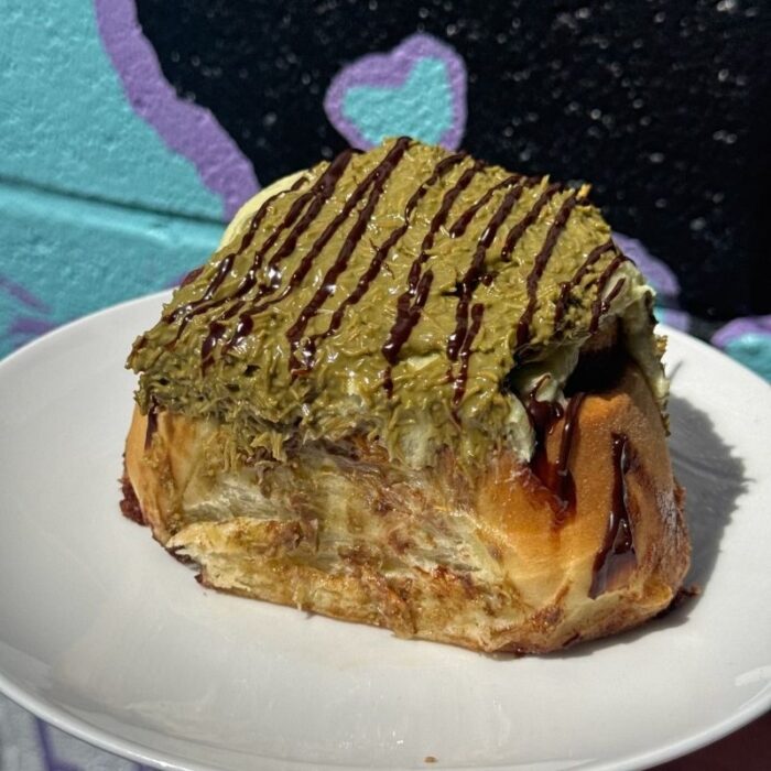Our classic cinnamon roll base, layered with a fluffy whipped pistachio cream cheese icing, topped with crunchy pistachio kataifi, finished with a drizzle of melted chocolate