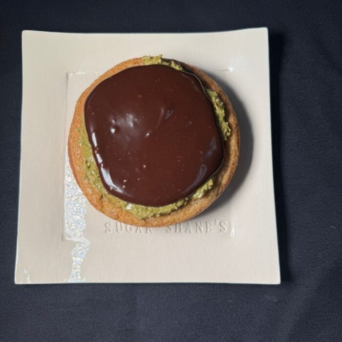 A soft brown butter base stuffed with crunchy pistachio katafi and finished with a healthy serving of rich chocolate ganache