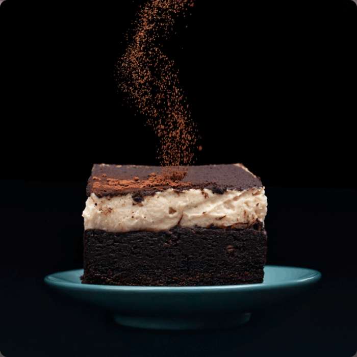 A rich brownie base layered with creamy espresso buttercream & topped with cocoa powder