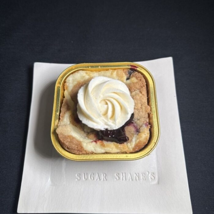 A fluffy vanilla base cake loaded with blueberries baked til caramelized and warm topped with a healthy scoop of vanilla buttercream