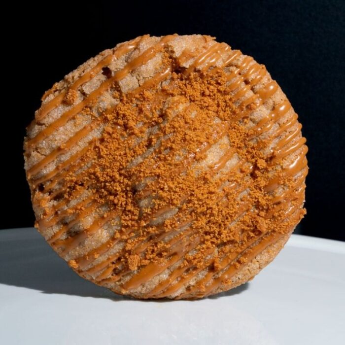 A soft cinnamon base cookie stuffed with cookie butter and drizzled with melted cookie butter and finished with more Biscoff crumbles