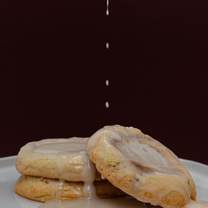A vanilla base cookie rolled into a spiral with a cinnamon sugar filling baked to perfection and finished with a vanilla bean glaze for the perfect combo